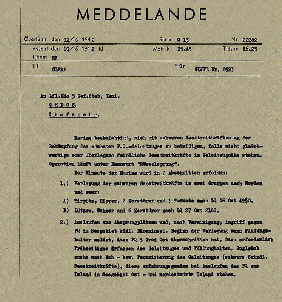 Orientering om tyska marinens planer för operation Rösselsprung till tyska flygvapnet i Norge. Detta meddelande sändes 20 dagar innan operationen inleddes. Förkortningen GKDOS betyder Geheime Kommandosache, det är sekretessgraden och motsvarar det vi skulle kalla Kvalificerat Hemlig i Sverige idag.