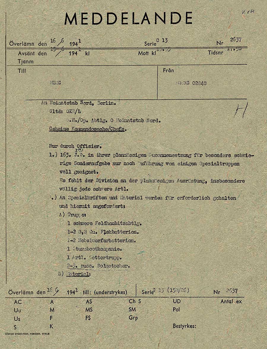 Meddelande om förberedelser för operation Barbarossa inom tyska 163. infanteridivisionen. Bland annat behöver man ryska tolkar. Det var denna division som transiterades från Norge till Finland genom Sverige för att kunna delta i angreppet på Sovjetunionen. Telegrammet skickades den 13 juni 1941.